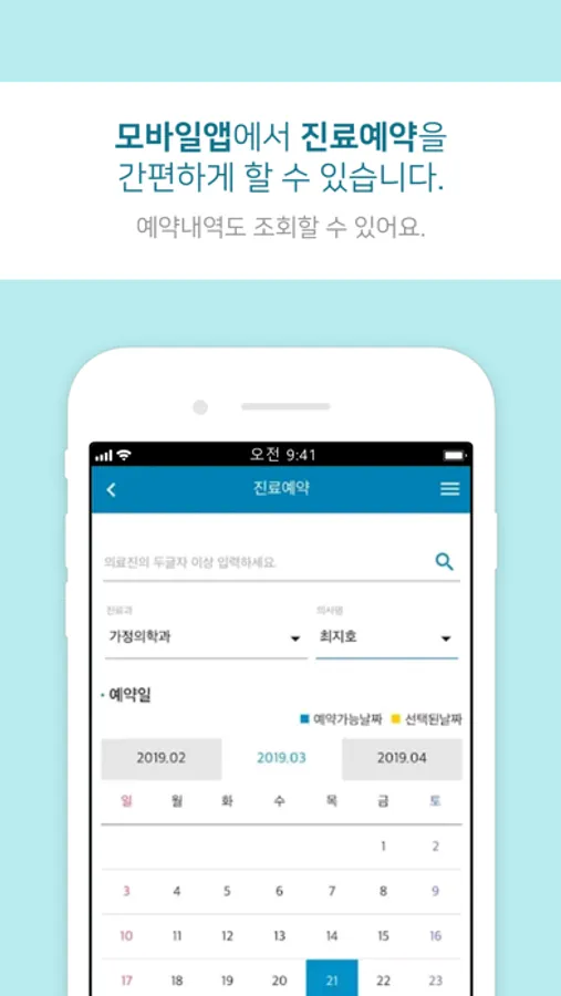 모바일 앱에서 진료예약을 간편하게 할 수 있습니다