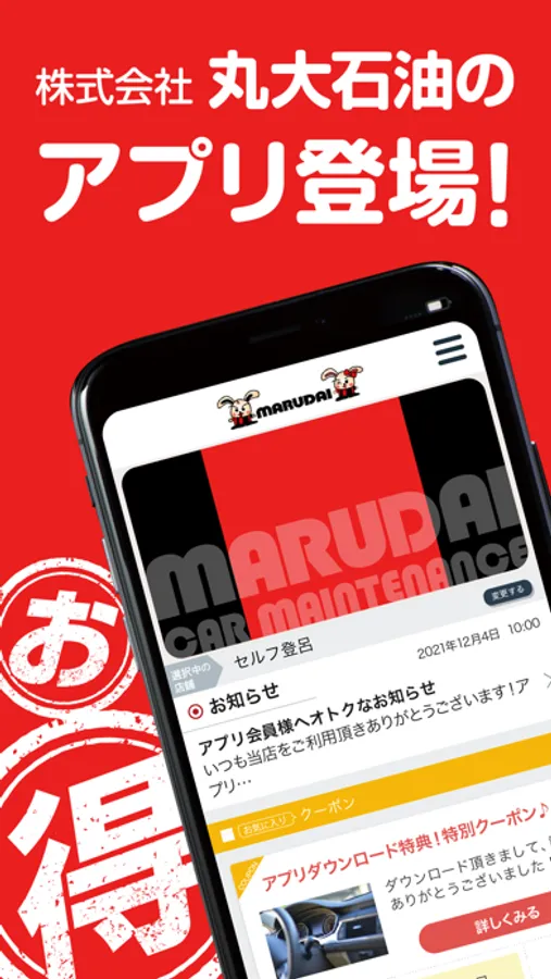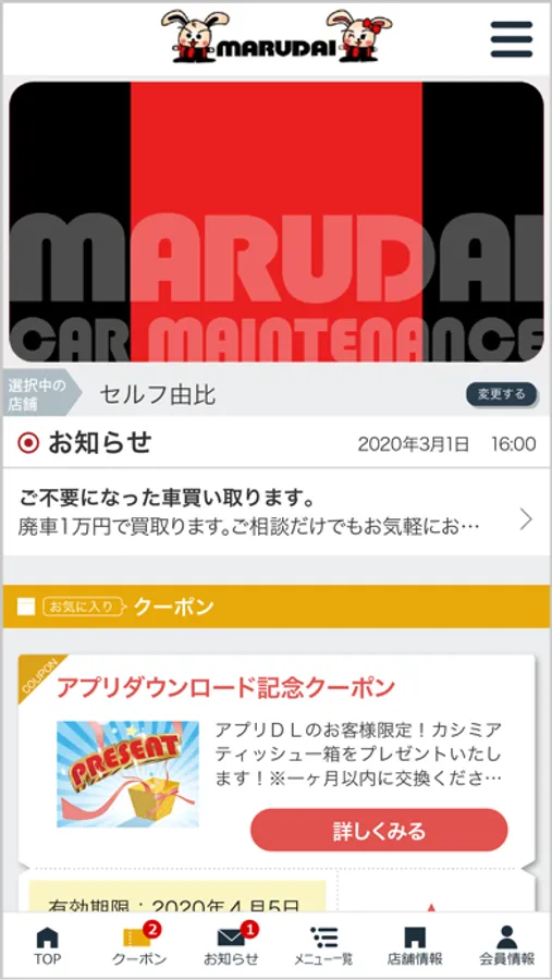 当社の公式アプリ「MARUDAI CAR MAINTENANCE アプリ」ではお客様のカーライフをサポートするための情報を提供中!ご登録いただいた店舗で利用いただけるお得なクーポンや各種メニューの割引情報や店舗からのお知らせなどを配信しております。