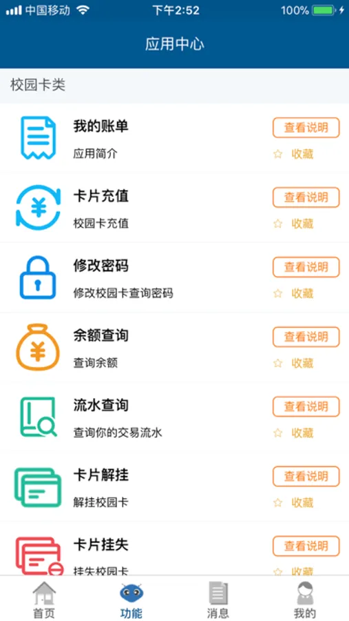 提供全面的校园卡服务,充值、信息查询、账单查询、流水查询、挂失/解挂、失卡招领、校园卡在线申请、校友注册等