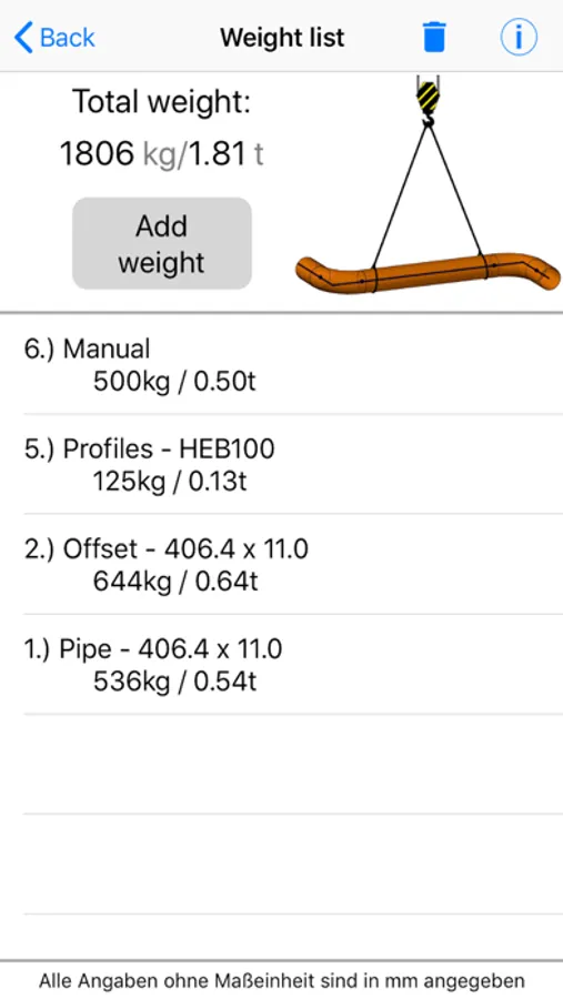 Single weights will be added to the list, so that you can use the weight of the construction units to choose the right lifting gear.
