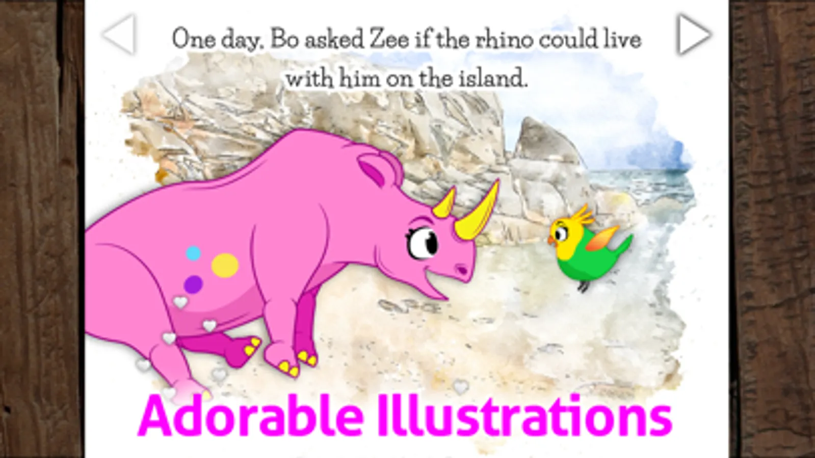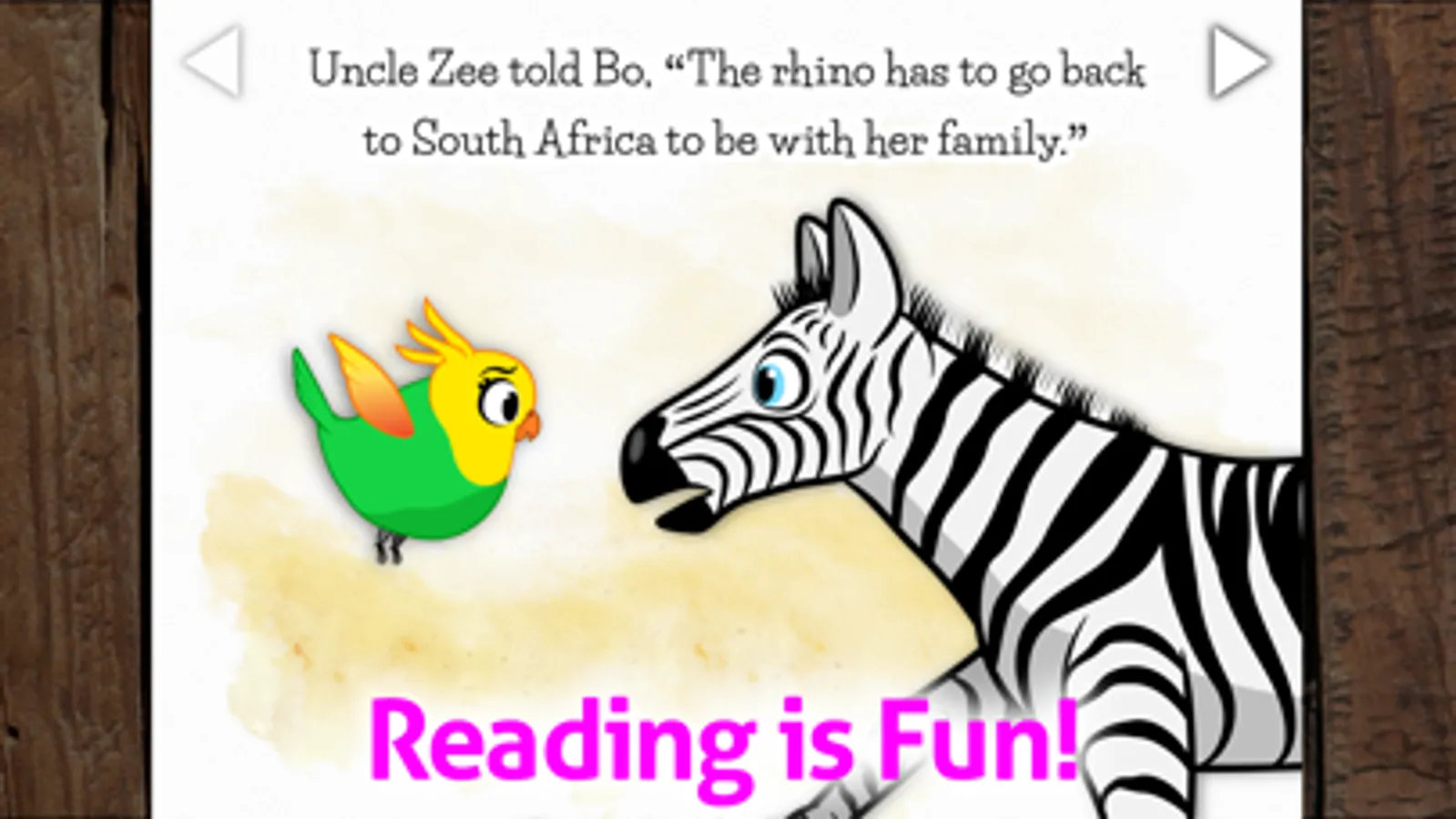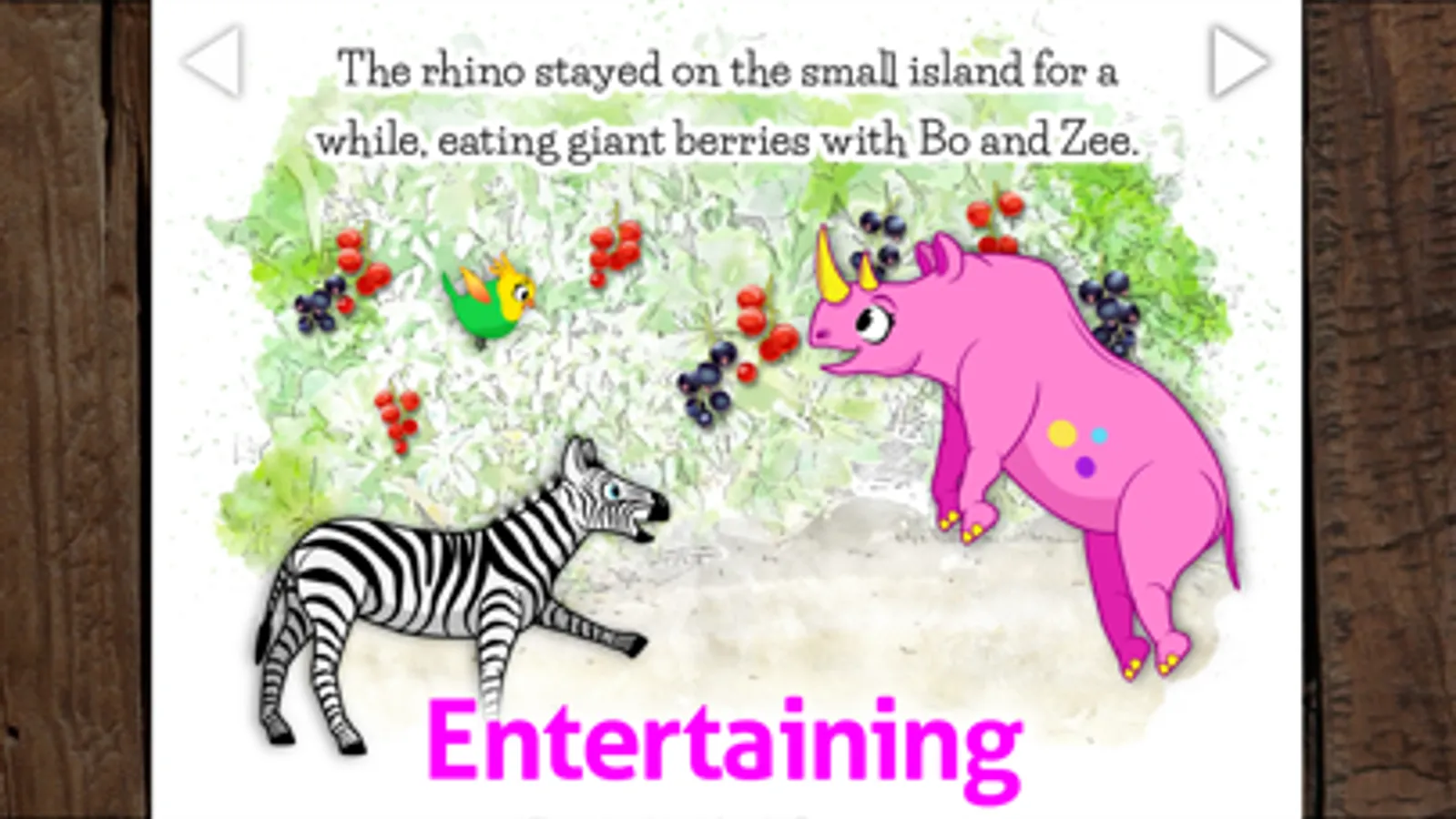 • Wildlife animal friends in this illustrated children's app - parrot, rhinoceros and zebra.