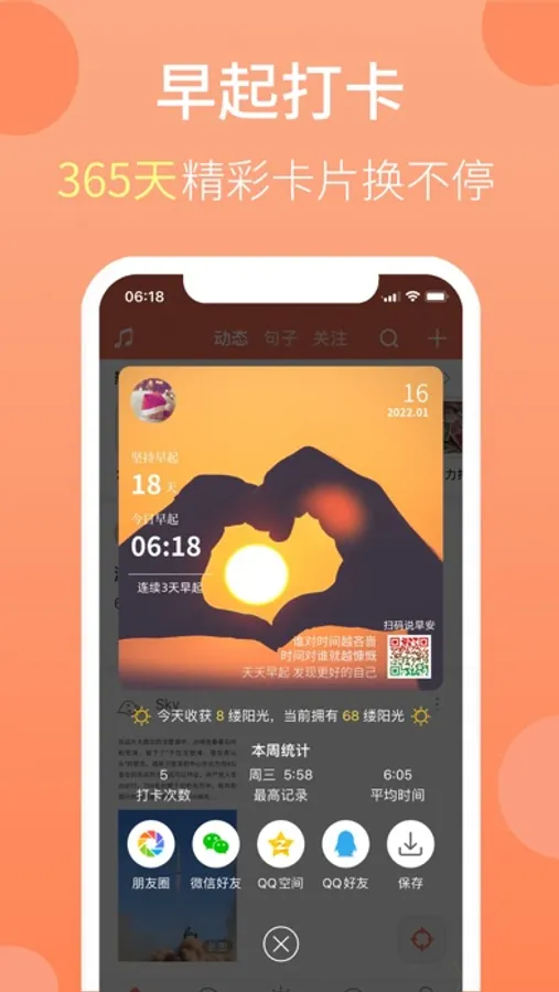 早起打卡:获取阳光及成就卡片,丰富的统计功能,通过日历及折线图展示早起早睡数据