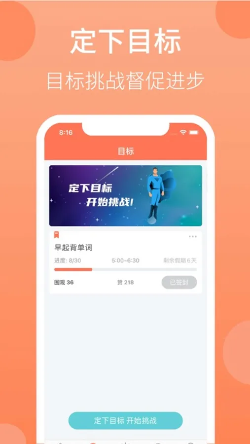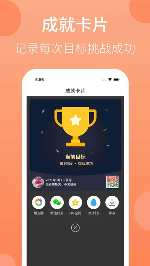 目标挑战:定下自己希望达到的目标,每次挑战成功后还有成就卡片,督促自己不断前进
