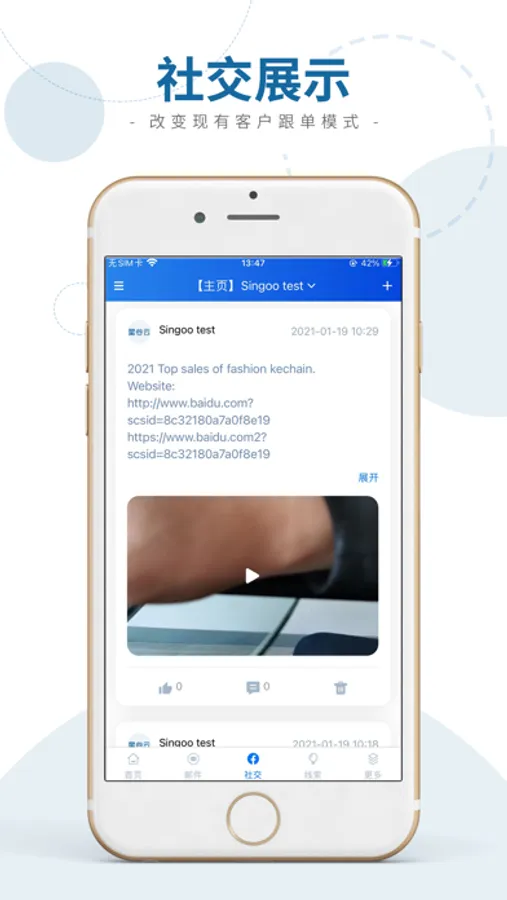 3, 社交管理:统一打理多社交平台账号,批量发布视频,图片,回复客户社交信息,社交商机及时通知,实时处理