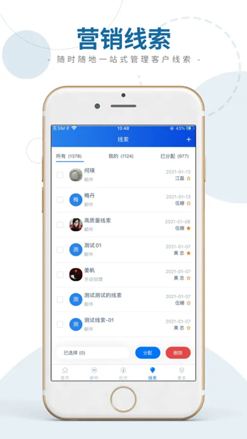 1, 线索管理,整合多营销端口线索统一管理,及时分配,及时跟踪,同步pc端数据,线索自用添加