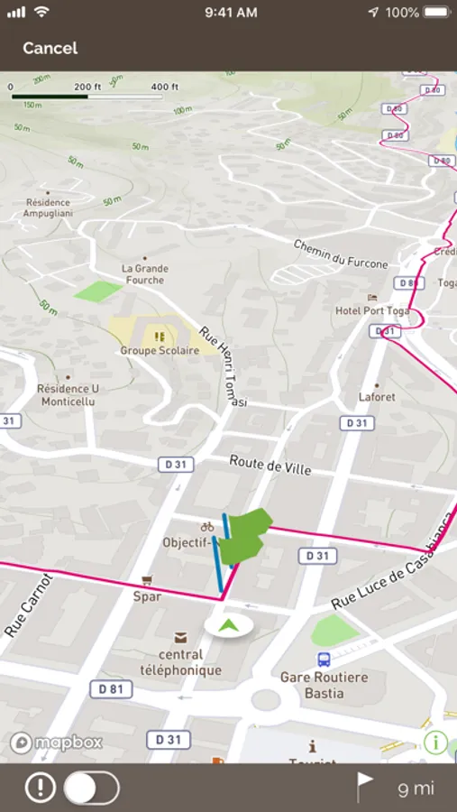 Once on the road or the footpath, follow your progress in real time on the map. The app works offline, even without a network (make sure that you download the data before you leave).