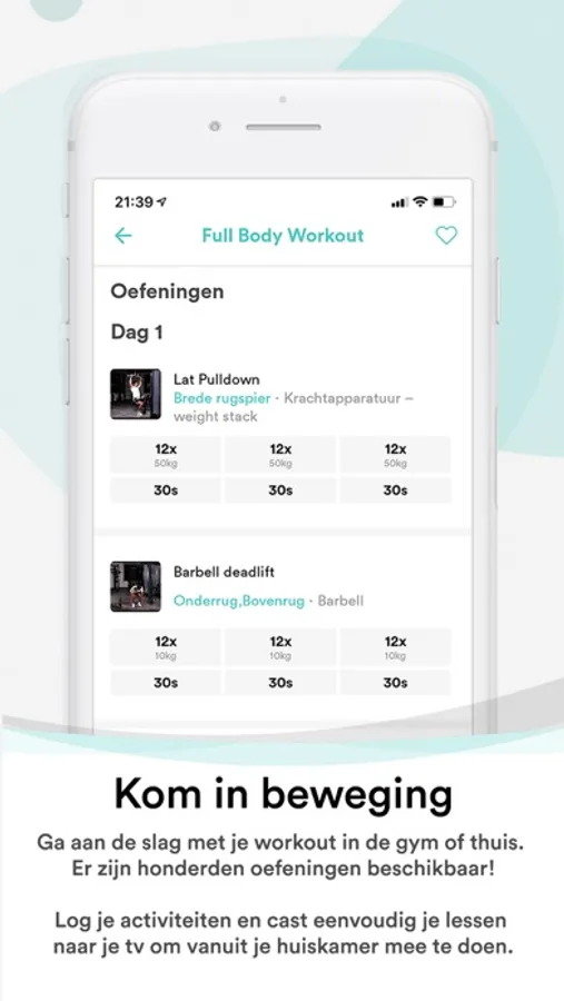 Op de Beweging pagina vind je workouts, lessen en activiteiten. Workouts voer je thuis uit of in de gym. Alles is eenvoudig te casten naar je televisie zodat je vanuit je huiskamer mee kunt doen. Ook kun je je sportactiviteiten bijhouden door ze te loggen.
