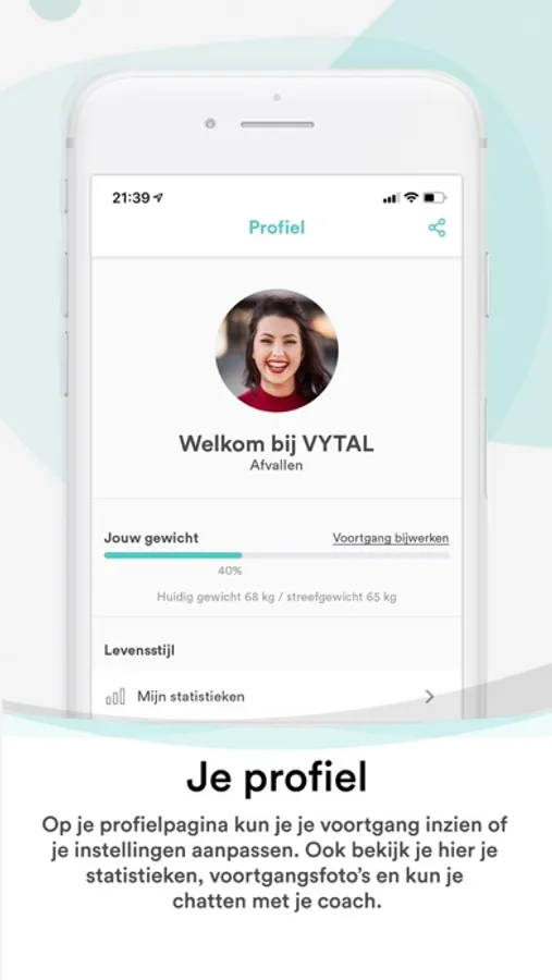 Vanuit de app kun je overzichtelijk je voortgang volgen in de statistieken en chatten met je coach om vragen te stellen.