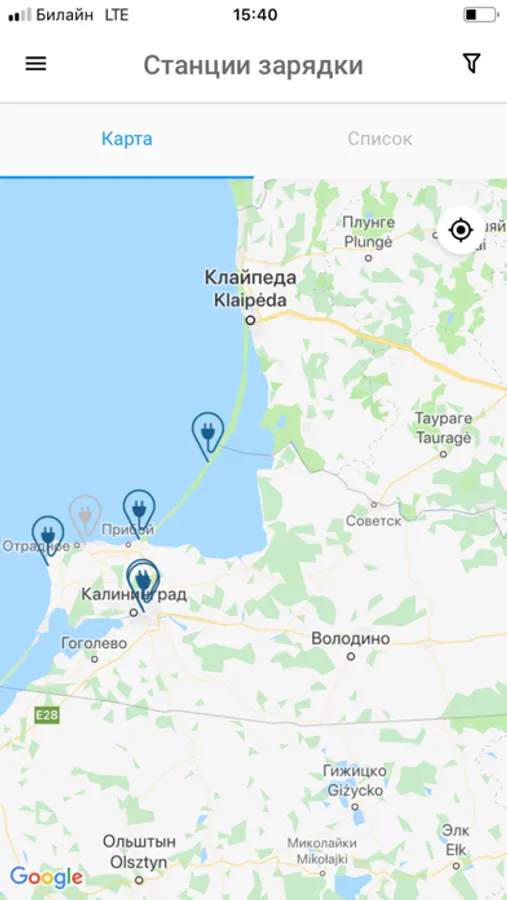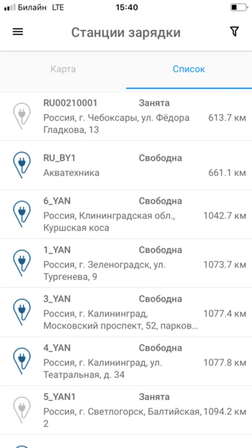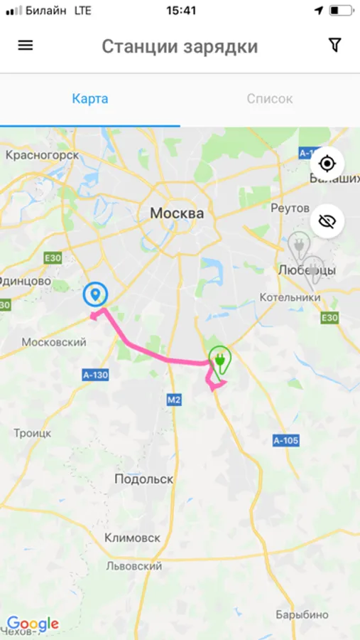 • Поиск зарядной станции на интерактивной карте с использованием фильтрации.