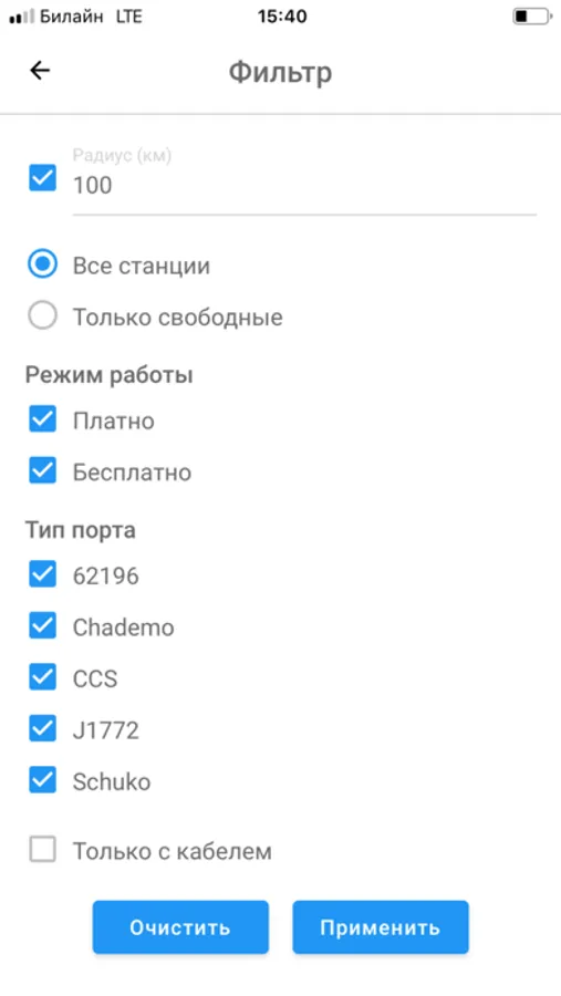 • Поиск зарядной станции по типу разъема и мощности.