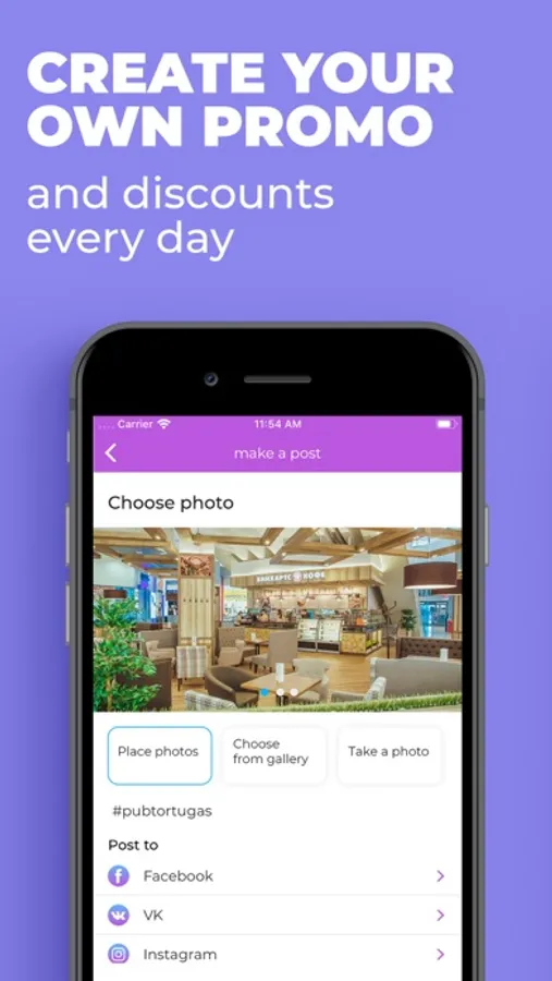 Choose the company in which you want to get a discount in the «Twindo» app, make a post to your social network, specify the hashtag of the institution (it is indicated in the company card), get likes from your friends and subscribers. You can spend the accumulated likes in the selected company.