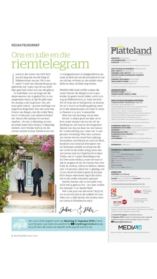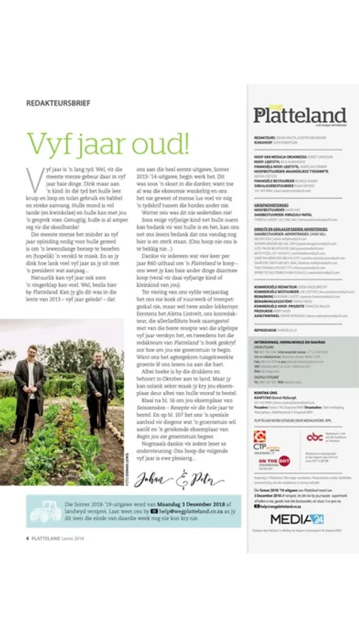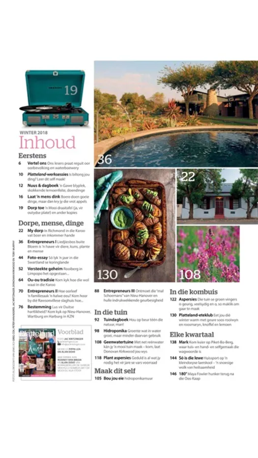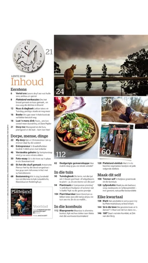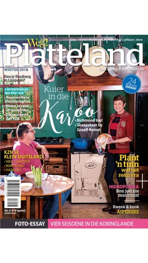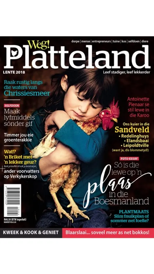 Leef stadiger, leef lekkerder: Weg Platteland vier die leefstyl en entrepreneursgees van die mense wie se hart in die platteland lê – of hulle klaar daar woon, daar grootgeword het, beplan om soontoe te trek, graag daar gaan kuier of net hunker na ’n lewe weg van die gejaag. Die tydskrif is prakties én inspirerend, en ewe lekker om te lees en te kyk met artikels oor entrepreneurs, selfdoenprojekte, diere, tuine, kos, dorpe en mense.