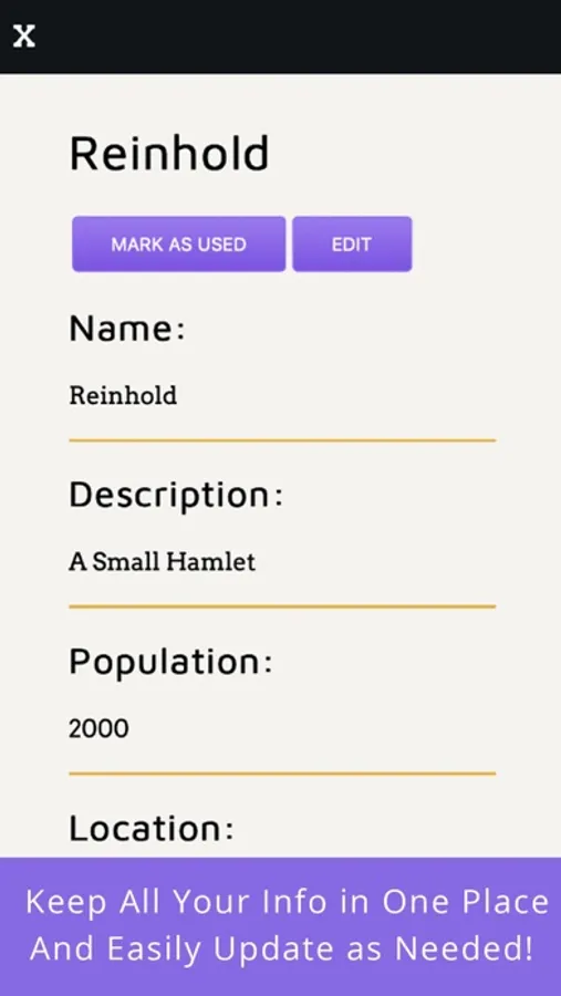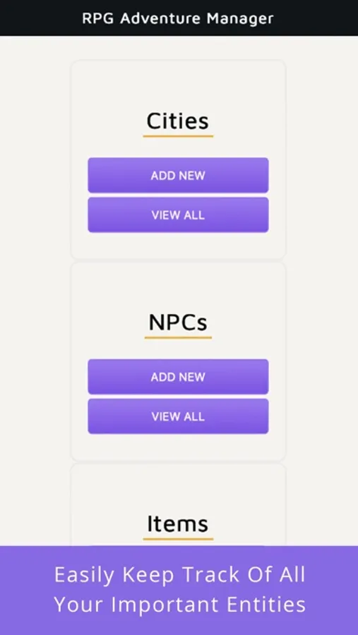 RPG Adventure manager is the perfect solution to keeping track of all your notes and ideas. Nothing derails a campaign like having to flip through pages of notes to find a forgotten NPC. With RPG Adventure Manager, that will never happen again. Keep all of the your game elements in once simple to reach place.
