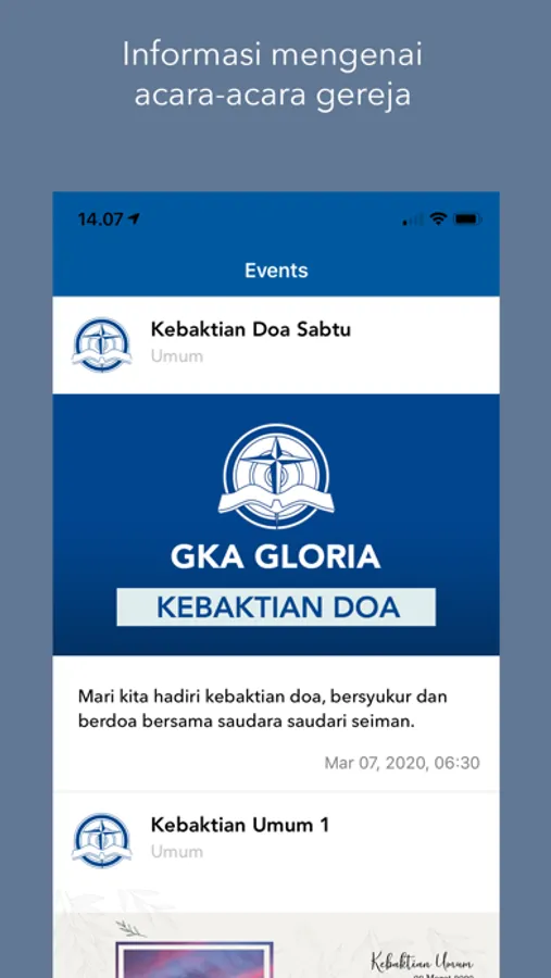 * Acara Gereja: pengguna dapat menemukan informasi tentang acara-acara yang diadakan oleh GKA Gloria, baik waktu dan tempat, maupun deskripsi dari acara
