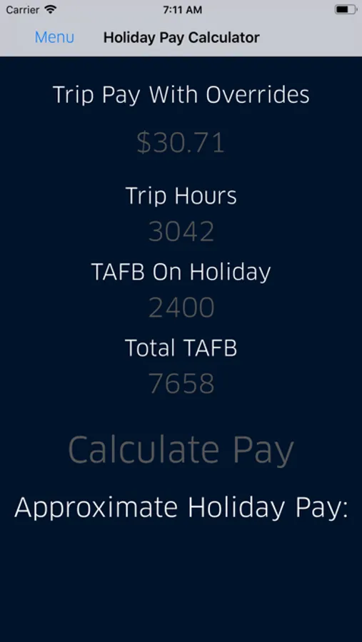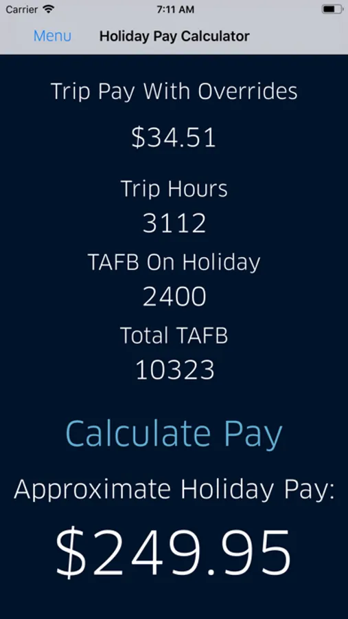 Confused or frustrated when trying to calculate your holiday pay ahead of a trip? Trying to decide if picking up that pairing is worth it for you? Enter a few details in this app and have your answer in no time at all!