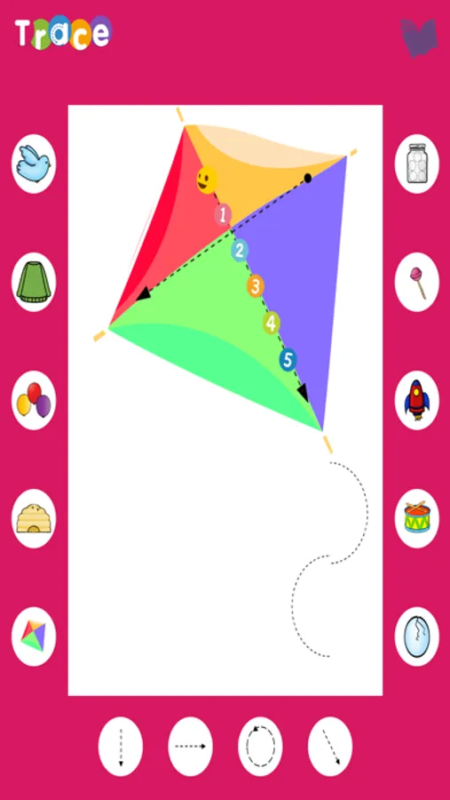 1. Practice Strokes - In this section, learners use different strokes such as vertical lines, horizontal lines, curves, circles, and diagonal lines to finish pictures. Learners can also just practice strokes by clicking on any of the images at the very bottom of the screen, too. These practice strokes resemble the strokes they'll need to make when writing letters, both uppercase and lowercase.