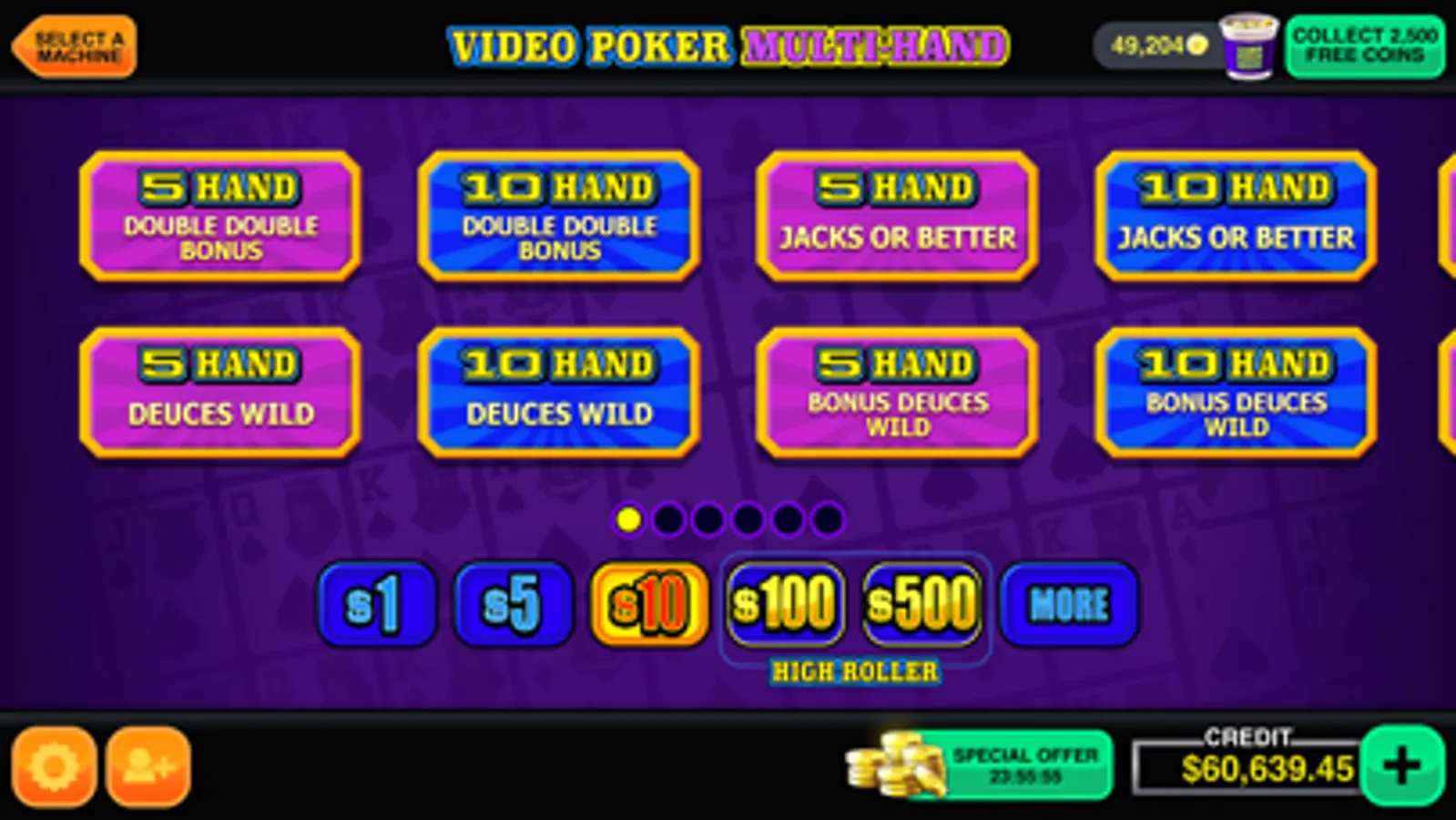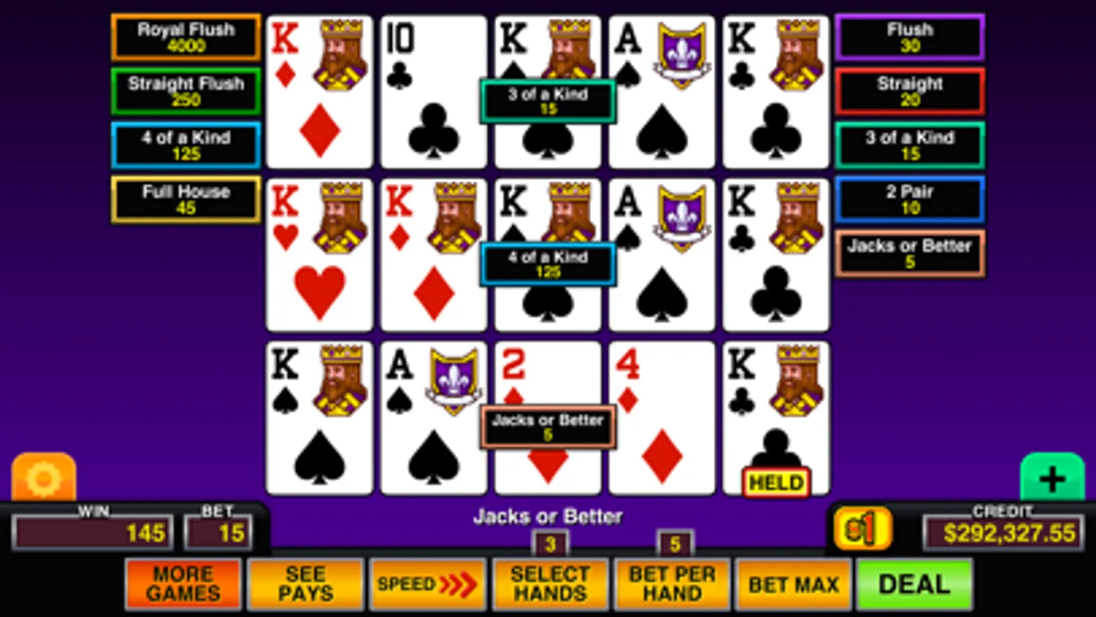 Video Poker Multi-Hand features your favorite Three Hand, Five Hand, and Ten Hand video poker games.