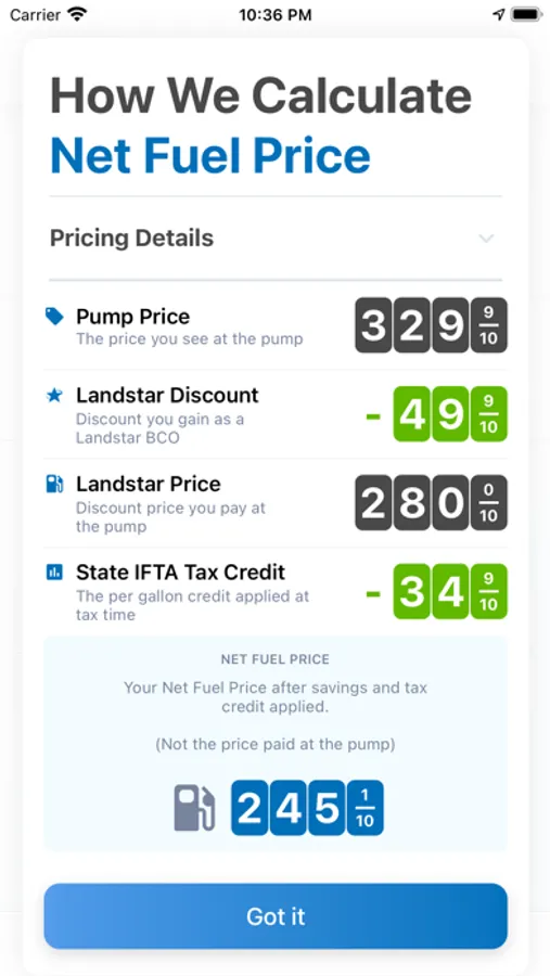 Find and save your favorite fuel stations, see Landstar fuel discounts, calculate your net fuel cost and more.