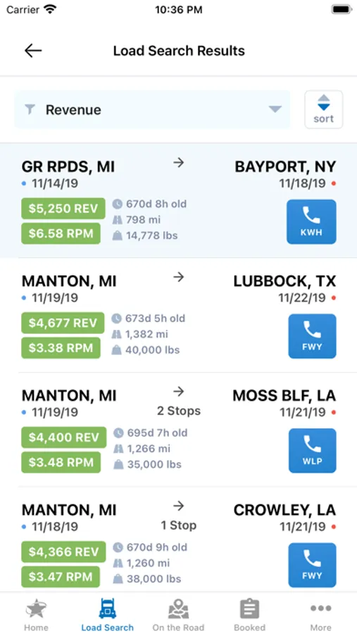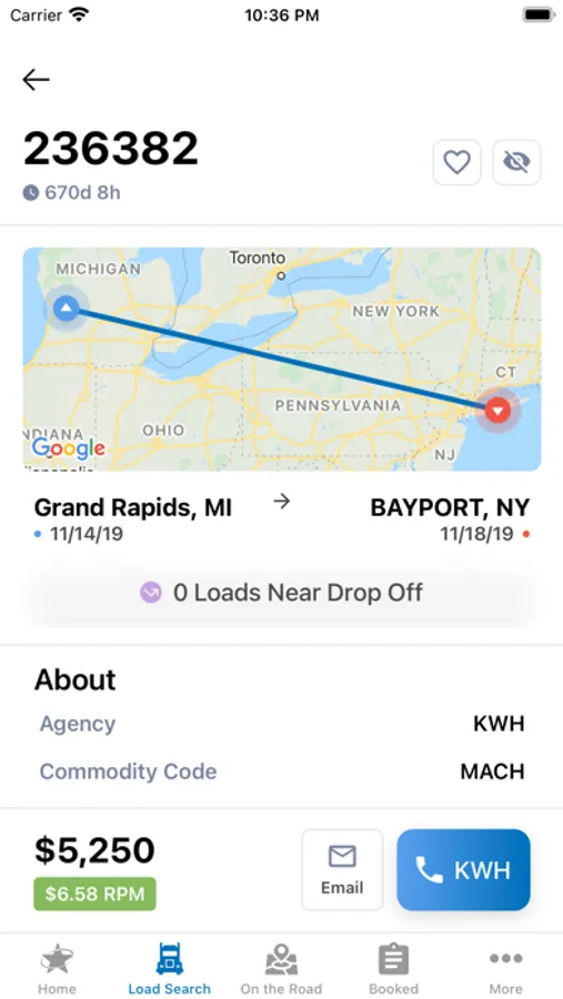 See important details for a load, including revenue, rate per mile, load dates and times, weight, miles, load age, load comments and more.