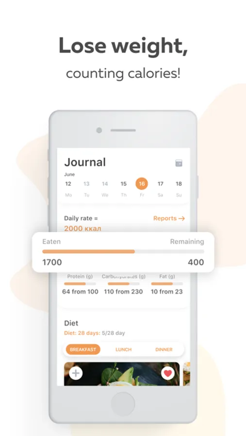 2. Food diary — add eaten per day food and easy to follow calorie diet. We have a large database of products and you will definitely find the one you need!