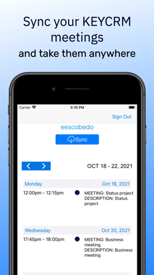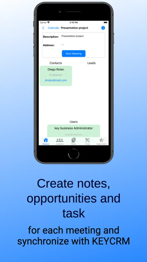 Mobile application based and developed for KEYCRM. Designed to capture and synchronize information during meetings, including tasks, notes and opportunities. GPS tracking to verify on-time arrival at the client in order to offer best costumer service.