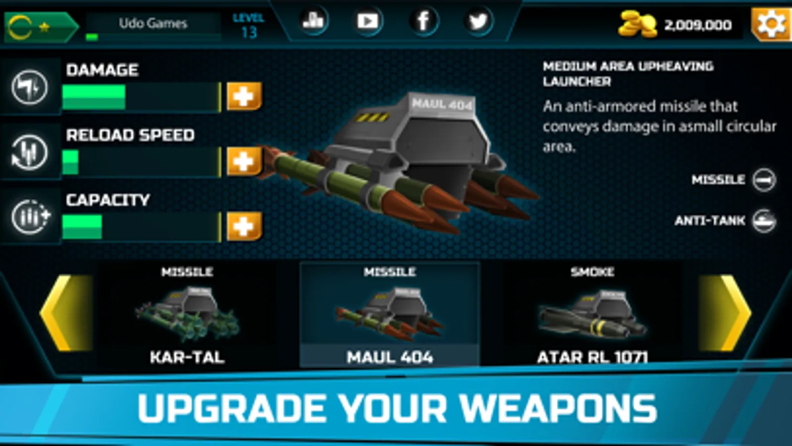 - Serial firing cannon, missile and bomb which can be upgraded as three main types of armament and 11 genuine weapons with all unique mechanics.
