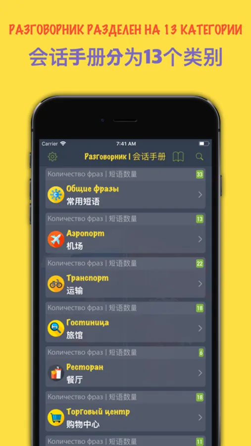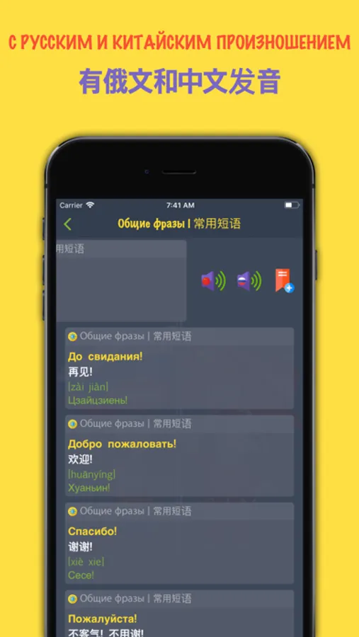 Русско – китайский разговорник содержит все необходимые слова и фразы с произношением по двум языкам, которые могут вам понадобиться во время вашей работы поездки бизнес или путешествия. Когда нажимаете на карточку воспроизводиться русские фразы, когда на иконку спикера нажмете воспроизводиться китайская фраза.