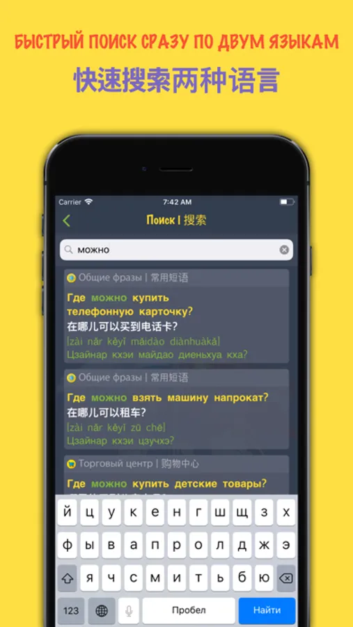 Используйте функцию поиска, чтобы быстро найти нужную вам фразу сразу по двум языкам.