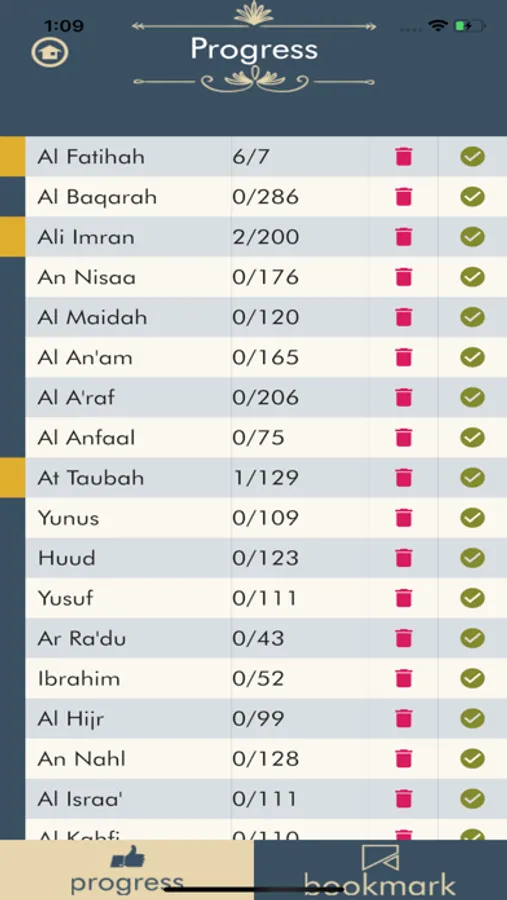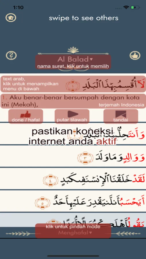 For this feature, we adopted Al-Qur'an At Taisir Ustadz Adi Hidayat, Lc., M.A. Our screen is divided into two (left and right) which are representations of the Mushaf in general. So that we not only memorize the verses, but also the location of the Mushaf. In this feature, each verse will be represented by the first word in the verse.