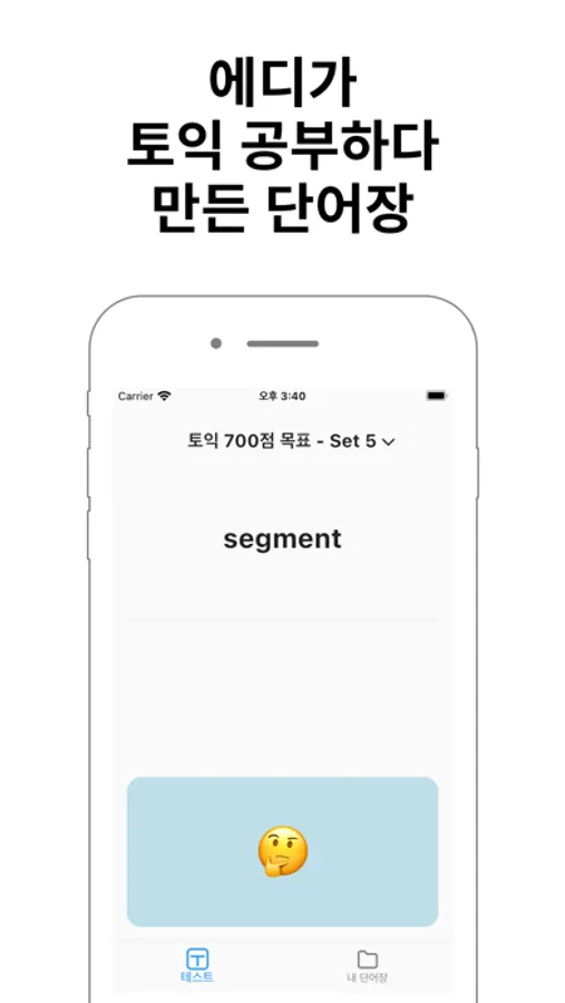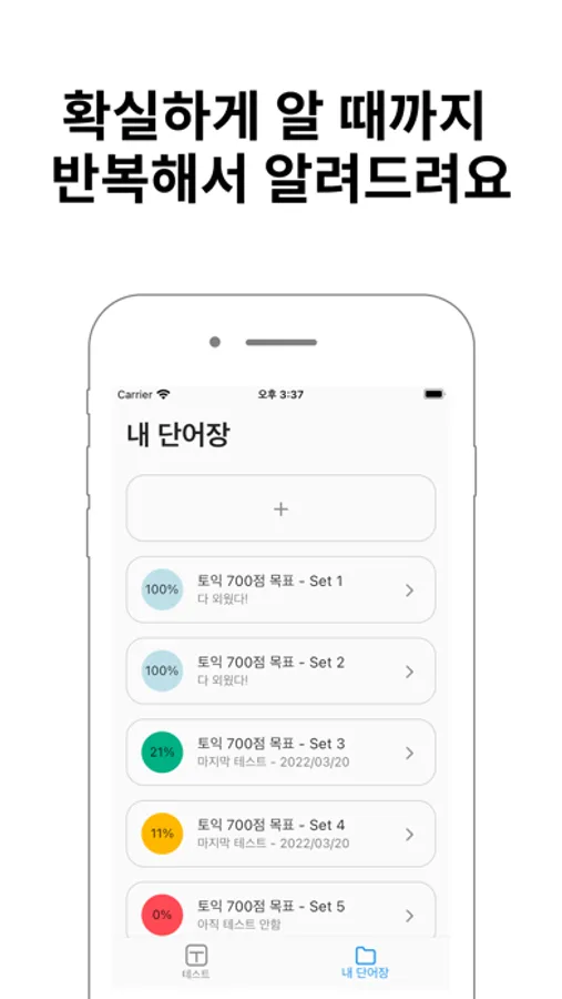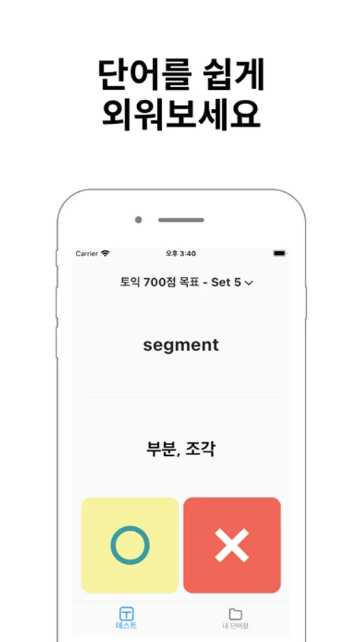 토익에 자주 나온다는 단어들로 단어 세트를 만들었어요. 한 세트에는 단어가 50개씩 있어요. 캠브릿지대학의 연구 결과에 따르면 50개씩 외우는게 가장 효율적이라고 할것 같죠? 테스트하면서 단어를 아는지 모르는지 알려주시면 앱이 자동으로 기록하고 잘 모른다고 표시한 단어만 알려줘요. 채점하는것 아니니까 솔직하게 답하면 되어요.