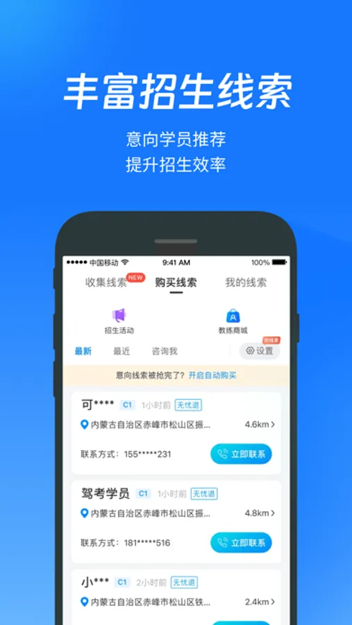 【驾校招生】 教练入驻教练宝典,可以随时收到从驾考宝典来咨询学车的学员信息,驾考宝典拥有千万学员,真正做到帮驾校解决招生的问题。