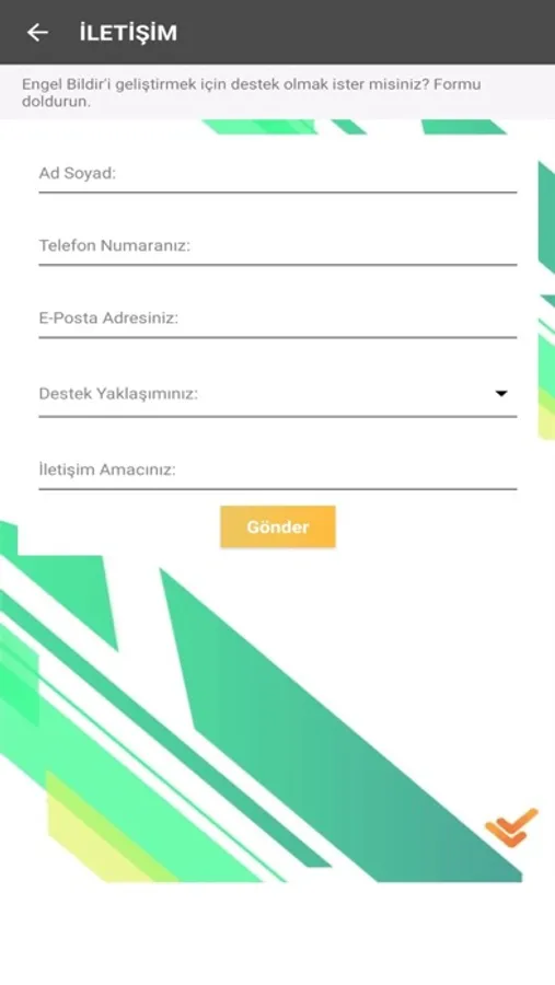 Engel Bildir sosyal sorumluluk projesinin amacına ulaşması için en büyük desteği ve katılımı Sivil Toplum kuruluşlarından göreceğine inanıyoruz. Bildirilen sorunları ilgili bölgede aktif olan STK’lar ile paylaşmayı ve sorunun çözümü için sürdürülebilir takip sağlanmasını planlıyoruz. Bu bağlamda sivil toplum kuruluşlarının yöneticilerini ve üyelerini bu sorumluluğu paylaşmaya davet ediyoruz.