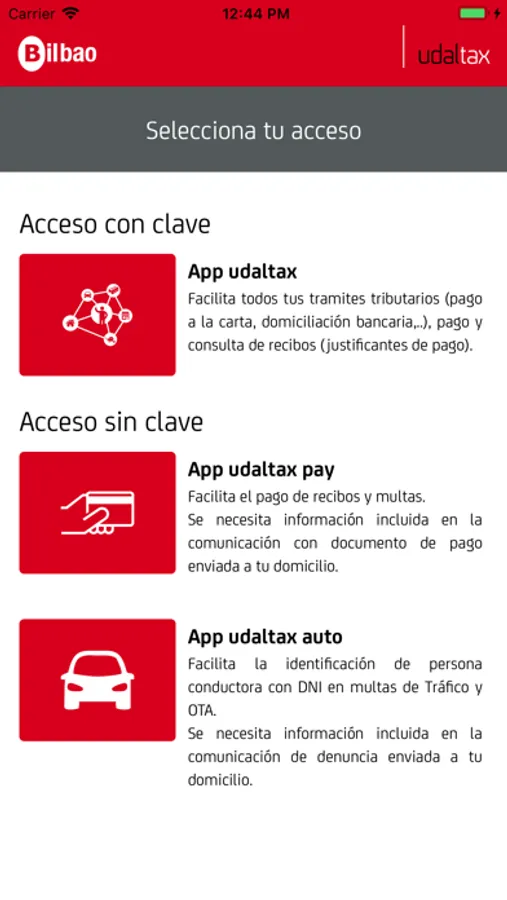 udaltax es la app del Ayuntamiento de Bilbao que facilita la consulta de tus recibos pagados y pendientes y sin necesidad de clave de acceso el pago de recibos y multas mediante tarjeta de crédito o Bizum a través de la versión udaltax pay y la identificación de persona conductora a través de su versión udaltax auto.