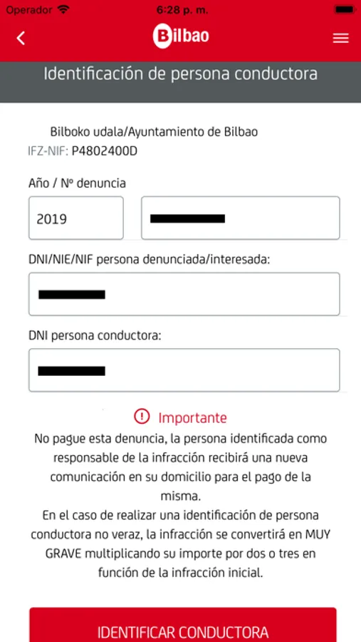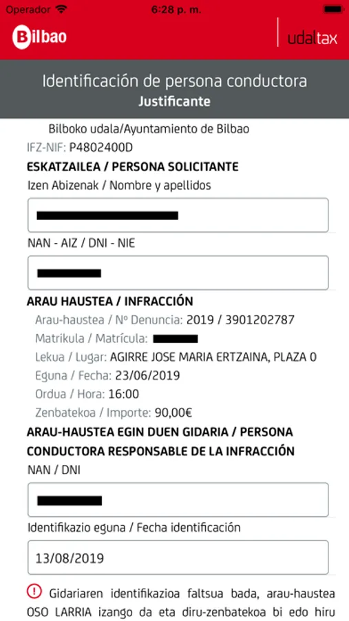 En la versión udaltax auto, introduce los datos de año y numero de denuncia indicados en la comunicación recibida en tu domicilio, el NIF de la persona denunciada y el DNI de la persona conductora identificada. A través de esta app no es posible la identificación de personas jurídicas o extranjeras.