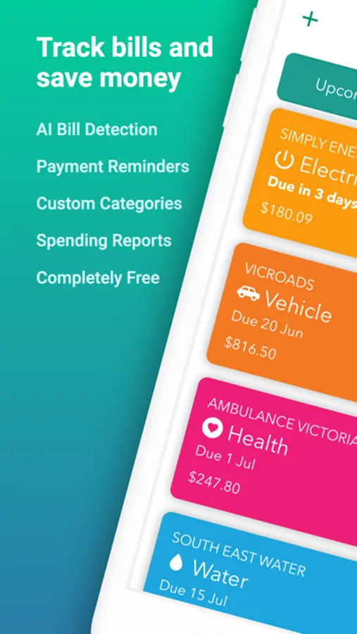 1. Smart bill detection and categorisation - connect your email and automatically detect and categorise bills as they are sent to you. Outlook emails are supported.