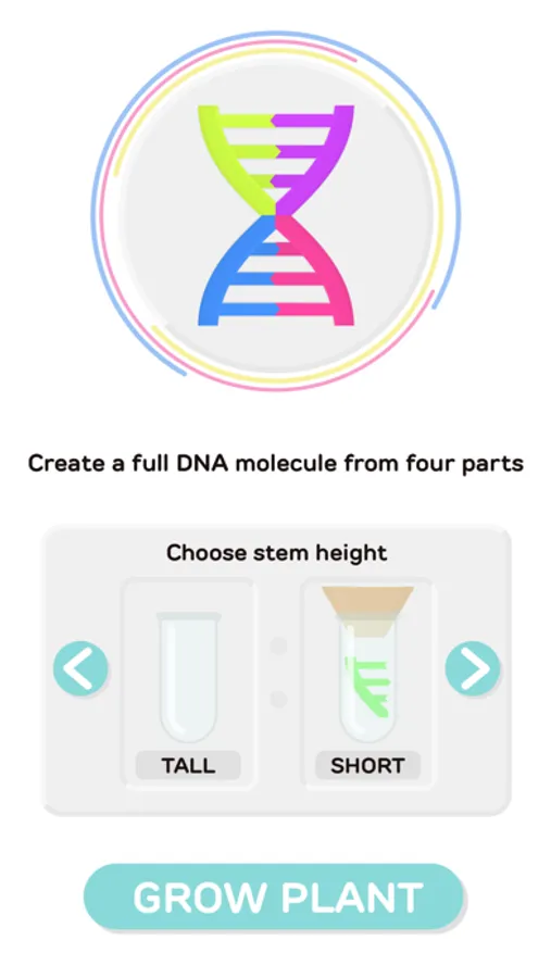The game is geared to kids and young at heart. Using a DNA molecule, you can change several characteristics of the plant in many combinations: stem height, leaf shape, flower shape and color. Then, after tapping a button you will see the results of your creation.