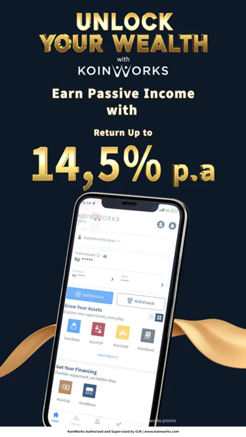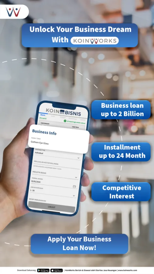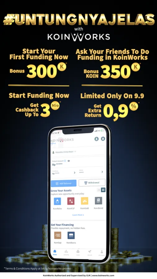 KoinWorks facilitates financial management and business capital loans for MSME owners with cash loans, invoice financing, employee loans, etc, with easy submission, low interest, without credit card or collateral. Also, facilitates asset development through business funding, Gold Savings/Investments, Bonds, etc. One of the pioneers of P2P Lending fintech in Indonesia, registered and supervised by OJK.