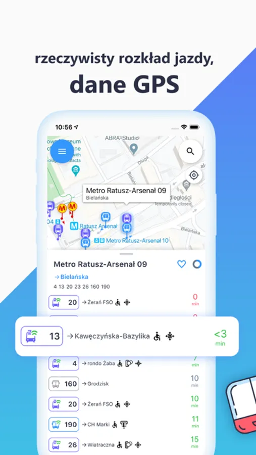 Dzięki korzystaniu z rozkładu jazdy LIVE transportu publicznego w aplikacji Time4BUS nie musisz przychodzić wcześniej na przystanek i czekać na przyjazd autobusu lub tramwaju, ale możesz sprawdzić za ile naprawdę przyjedzie, śledzić jego pozycję GPS na mapie i dotrzeć na przystanek równo z jego przyjazdem.