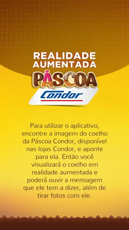 2 – Para utilizar o aplicativo, encontre a imagem do coelho da Páscoa Condor, disponível nas lojas Condor, e aponte para ela. Então você visualizará o coelho em realidade aumentada e poderá ouvir a mensagem que ele tem a dizer, além de tirar fotos com ele.