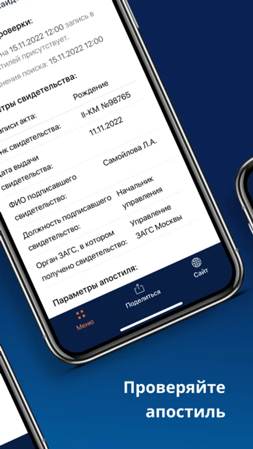 С приложением Реестр ЗАГС проверка свидетельства и апостиля, формирование квитанции и оплата государственной пошлины, а также поиск ближайшего органа ЗАГС стали еще удобнее. Чтобы зарегистрироваться, просто укажите имя и номер телефона.