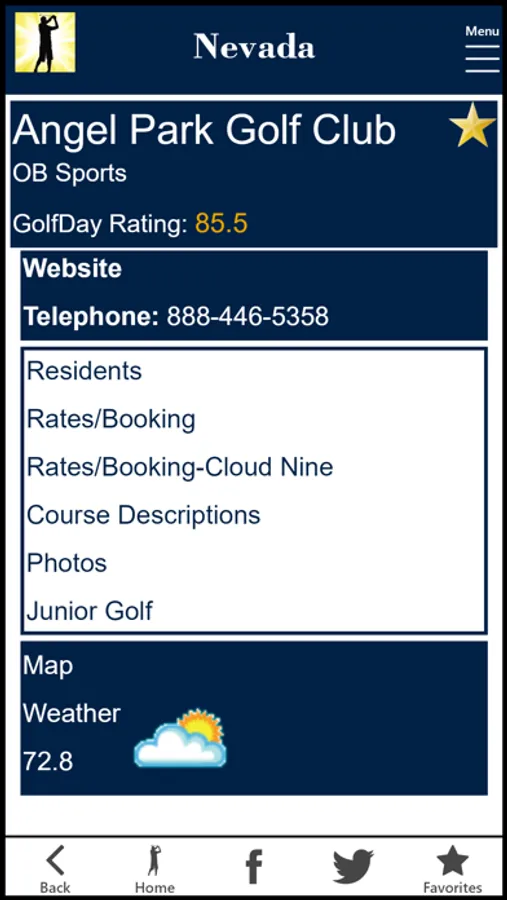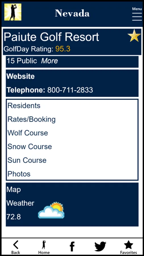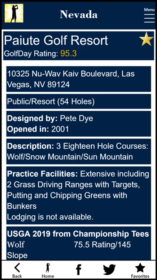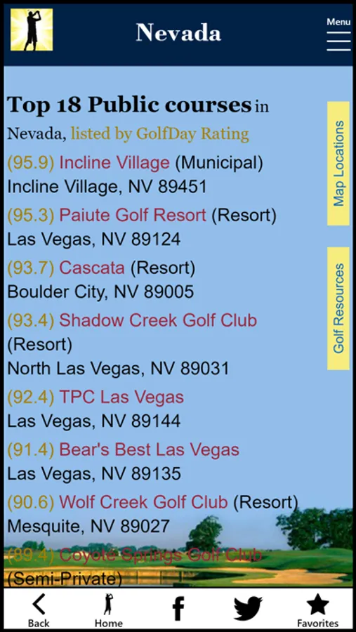 GolfDay Nevada includes over 85 golf courses in the state of Nevada with a GolfDay Rating and proximity search making it easy to find a great track near you or where you plan to be. Listings also include rates, booking links, course detail, golf league and Junior golf information, mapping/directions and local weather. Don’t waste your valuable time at a Dog Track!