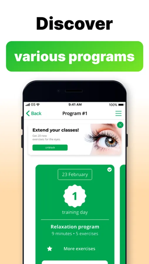 The main goal of our program is to give everyone a chance to have clear vision. Uniquely designed plan of short trainings. Download the app and start improving your eyesight right now!