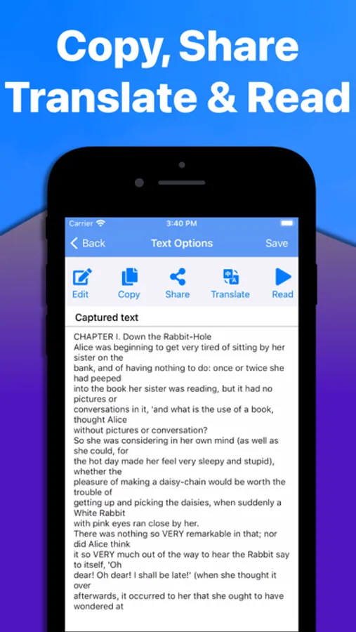 Text Capture allows you to capture text from your device's camera. Just point the camera, see the text in real time and capture it by pressing the Capture button!