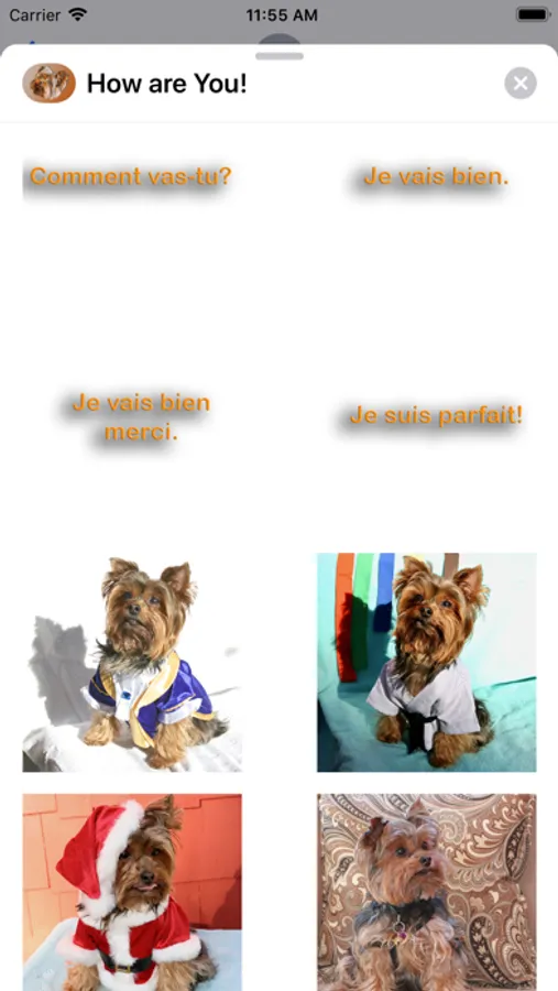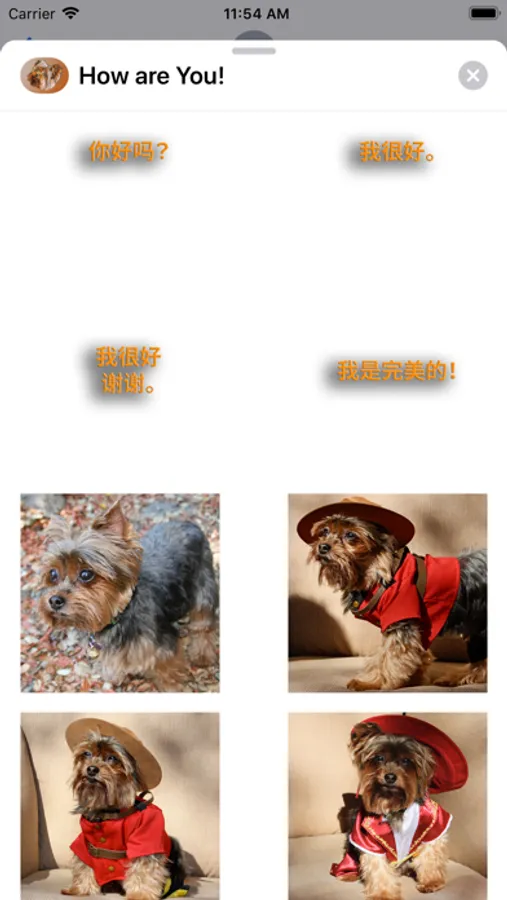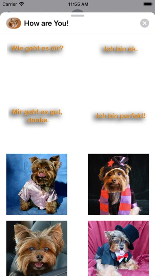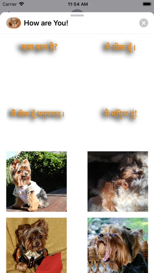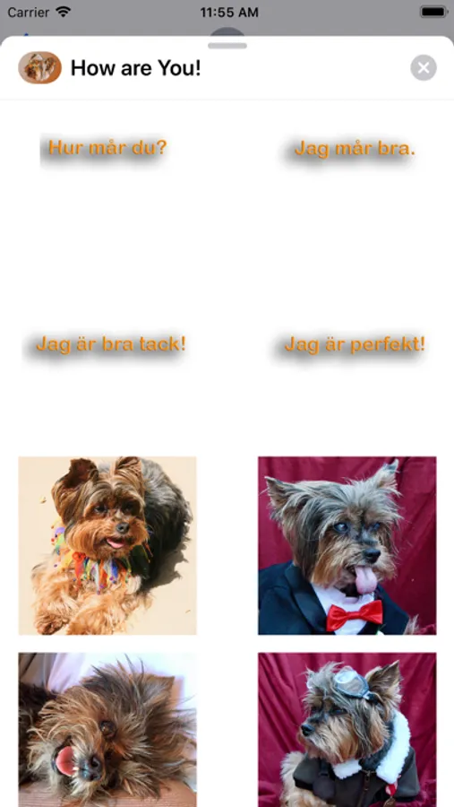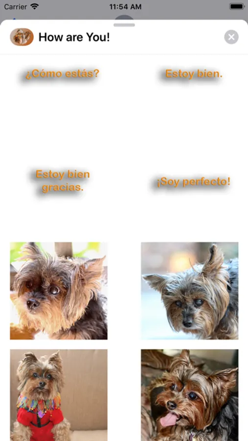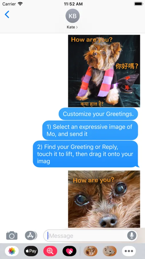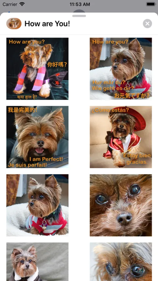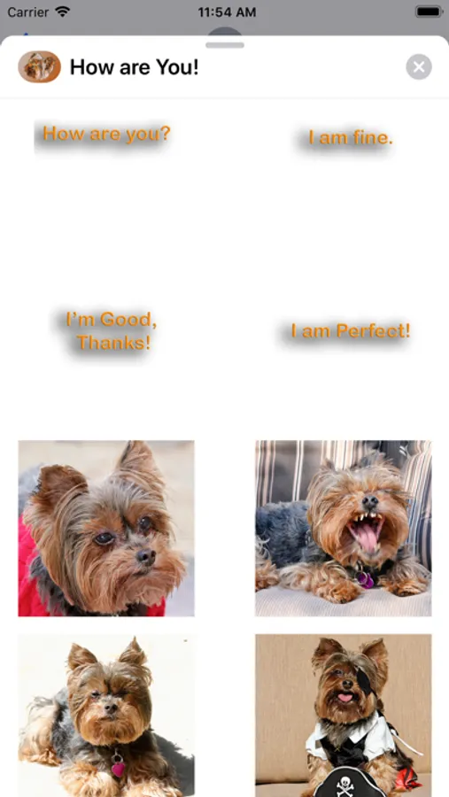 Select from 36 expressive images of Mo, a lovable Yorkshire Terrier, as a base to build your customized way to ask "How are You?" in Messages, or to reply.
