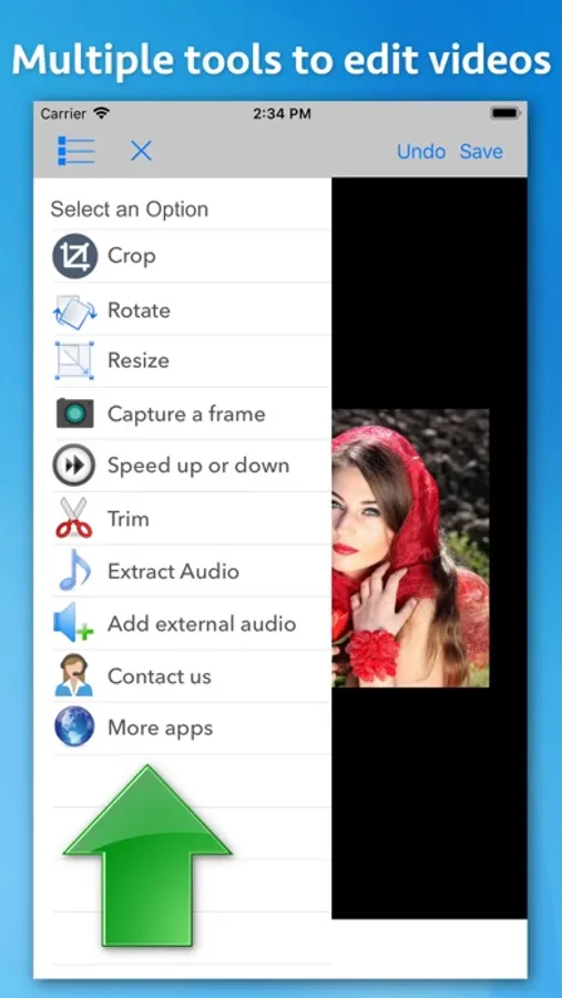 Crop, Speed up, Speed Down, Rotate, Capture frame, Resize, Trim, Extract sound and Add Sound to the videos. The application offers various tools to adjust and enhance your videos.