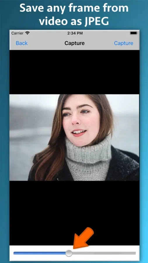 -- Capture any frame : Capture any frame from the video and save it as a JPEG image file. Use the slider in the application to traverse through the video and capture the frame from anywhere in the video.