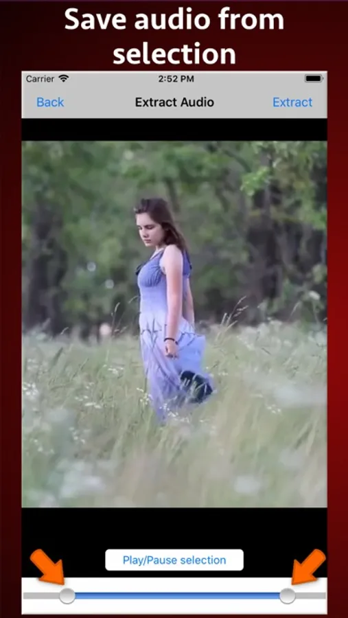 -- Extract sound : Extract sound/audio from a video and save it as a separate audio file. You could also extract sound from only selected part of the video and save it as a separate audio file. The extracted audio could be shared easily with other applications as well.