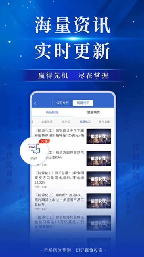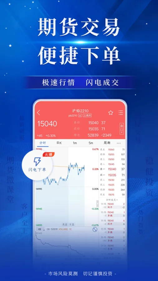 【行情交易】:闪电下单,提供商品期货、金融期货、期权等全品种交易服务;支持条件单、画线等功能;资金安全有保障,打造便捷的期货投资体验