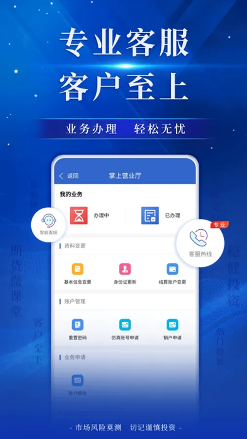 【业务办理】:线上办理银期转账、修改/重置密码、变更资料等业务,足不出户,简单高效;直连您的专属客户经理,及时响应您的需求