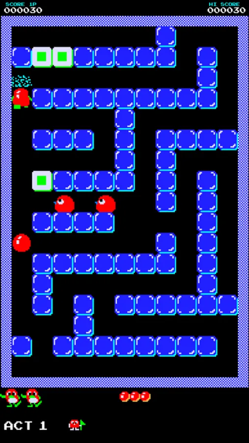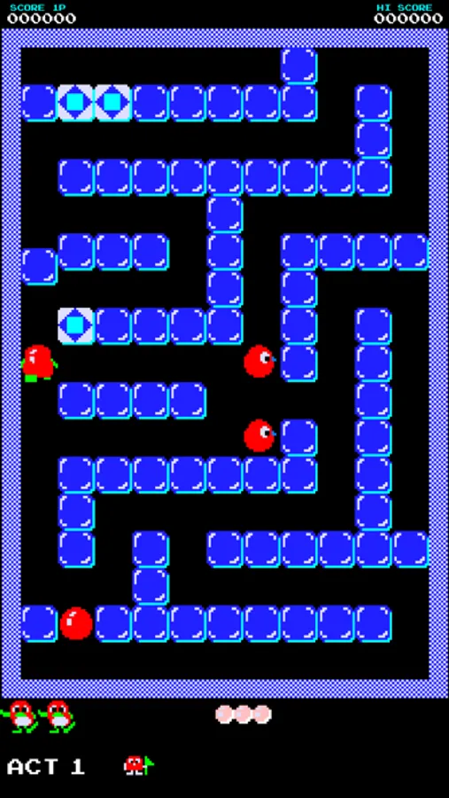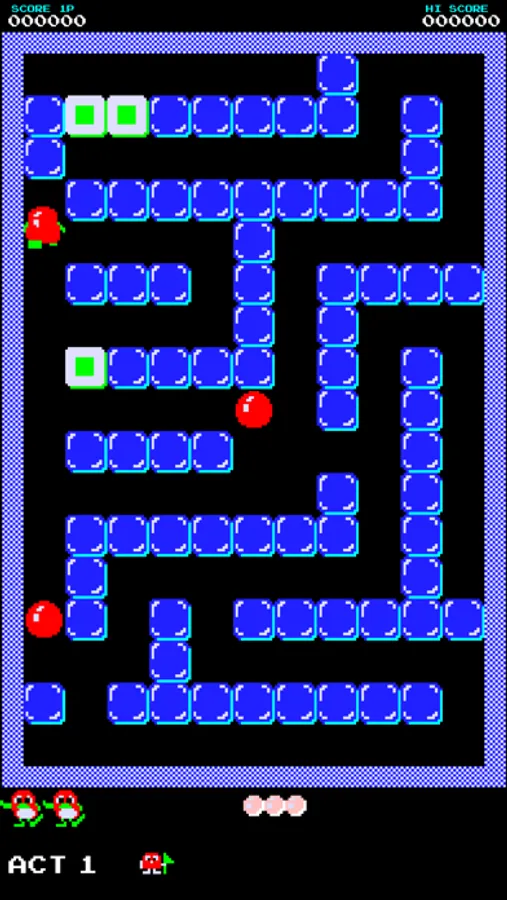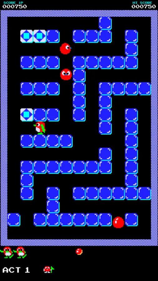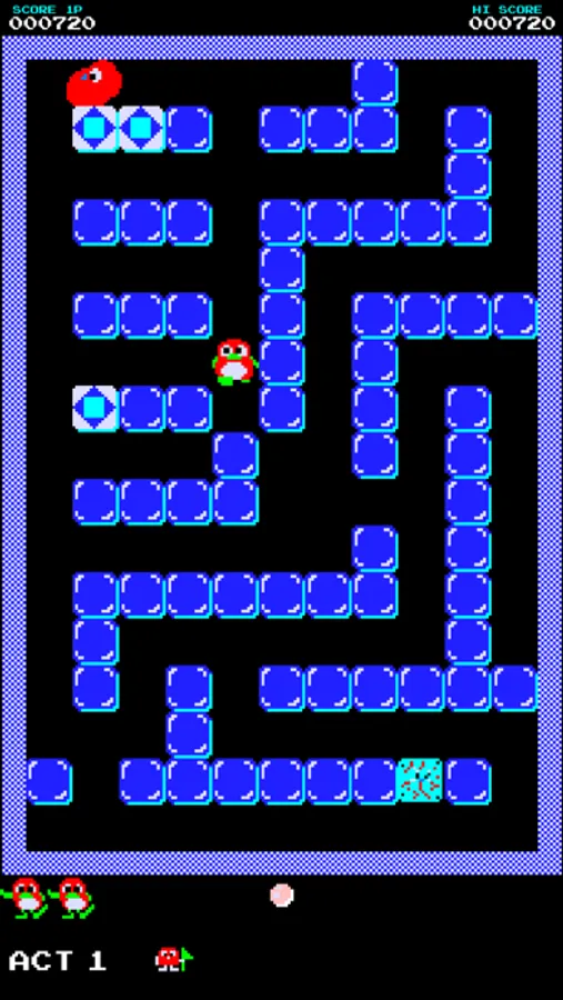 At the start of each Level blocks flash to indicate that they contain eggs. As the player destroys active SnowBees, new ones birth from the eggs to replace them. The SnowBees can crush blocks in an attempt to reach Pengo. Pushing against a wall causes it to tired and temporarily stuns any SnowBees in contact with it.